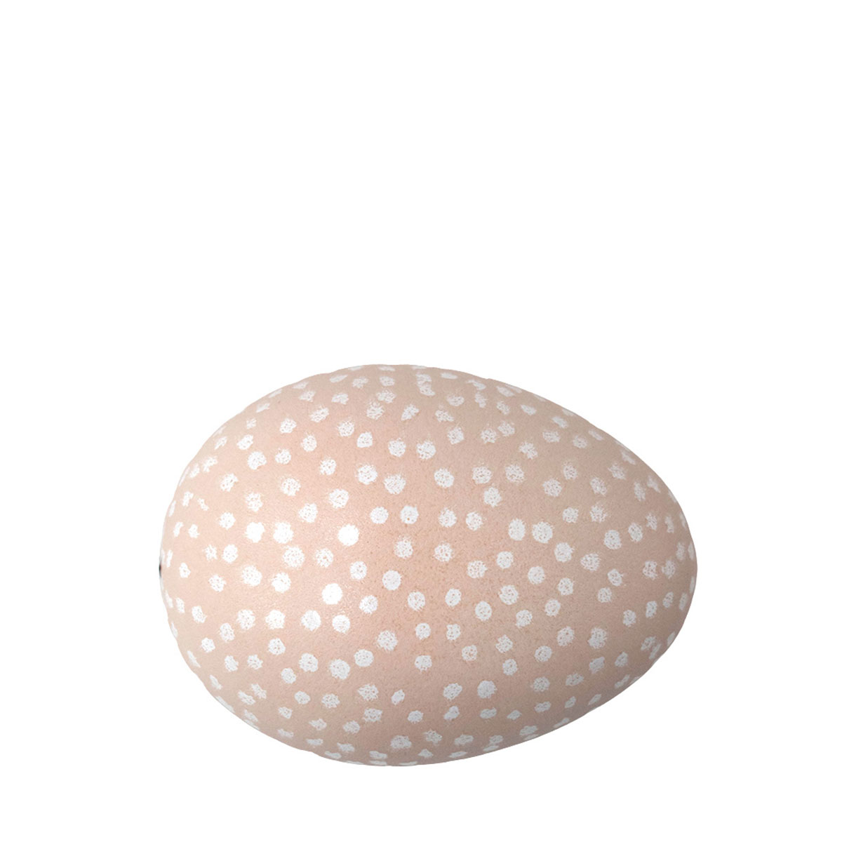 Paradisverkstadens handmålade ägg i keramik med prickar. Bottenfärg rosa och med vita prickar. Mixa och matcha ägg med olika utseende för en härlig påskkänsla. Ägg fotograferat ovanifrån. Prickarna på äggen skiljer sig lite åt eftersom de är handmålade.