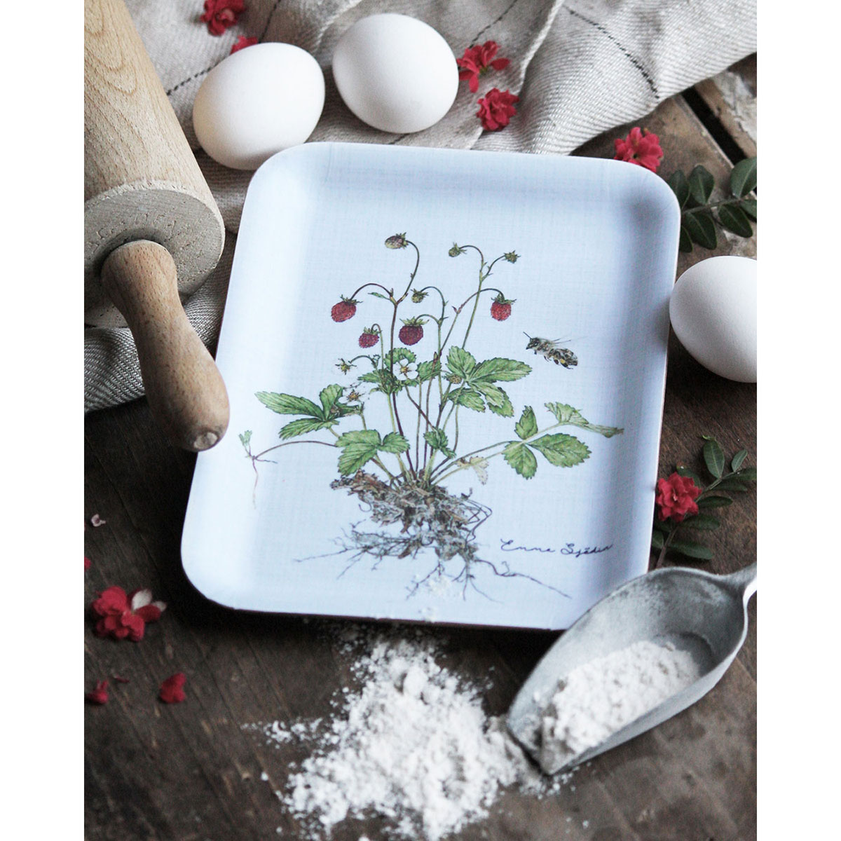 Bricka med det somriga motivet skogssmultron. Produkten formpressas en och en för hand. FSC-certifierad. Kollektion ’Nyponros, Prästkragar, Blåklockor, Skogssmultron’ ingår i Emma Sjödins botaniska serie av vilda skandinaviska blommor och vackra insekter. Emma har här kombinerat sina favorittekniker blyerts & akvarell och skapat detaljerade tidlösa bilder. Målsättningen har varit att på ett konstnärligt sätt visa blommans uppbyggnad i knoppar, utslagna blommor, dess stjälk och bladens utformning. Förlagorna kommer från egna studier och kompositioner av blommor från sommarängarna i Småland vid gården Frövik.
