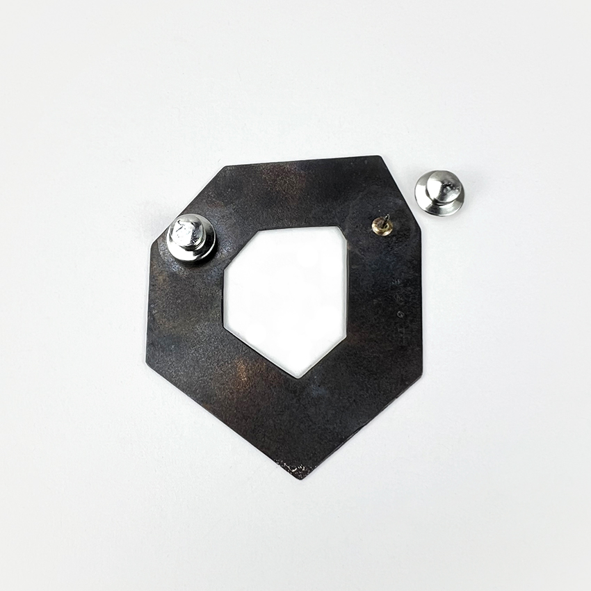Geometrisk brosch i linoljebränt järn av AnneLouise Messing.