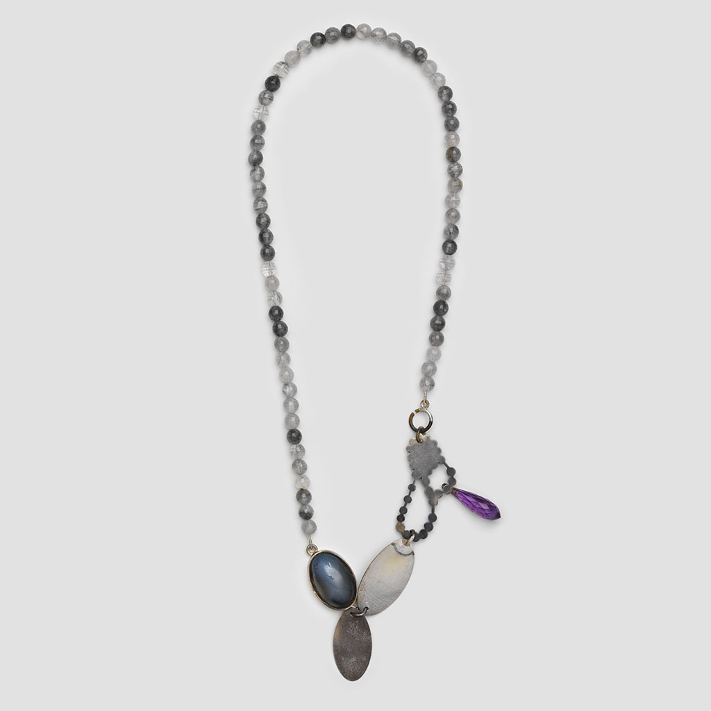 Halsband i silver med grå kvarts, agat och ametist av Åsa Lockner. Ca 54 cm långt.