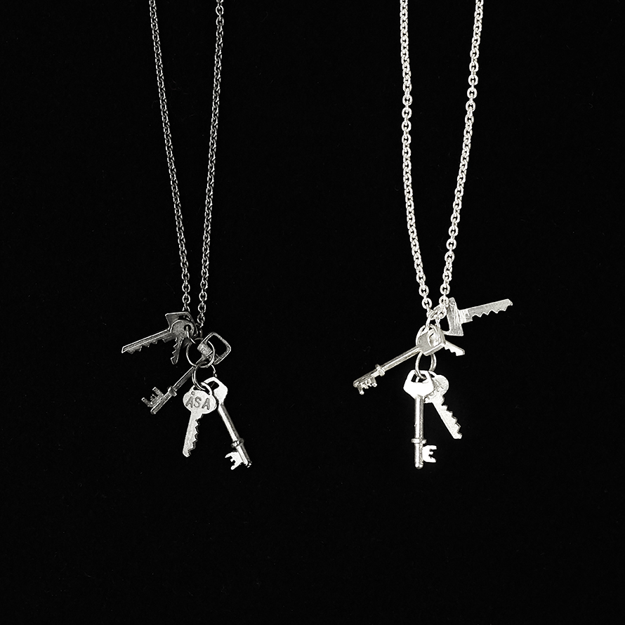 Halsband med 5 st små nycklar på kedja av Åsa Elmstam. Den största nyckeln är ca 16,5 mm hög. Oxiderat silver: Kedja utan lås, ca 65 cm Silver: Kedja med lås, ca 53 cm