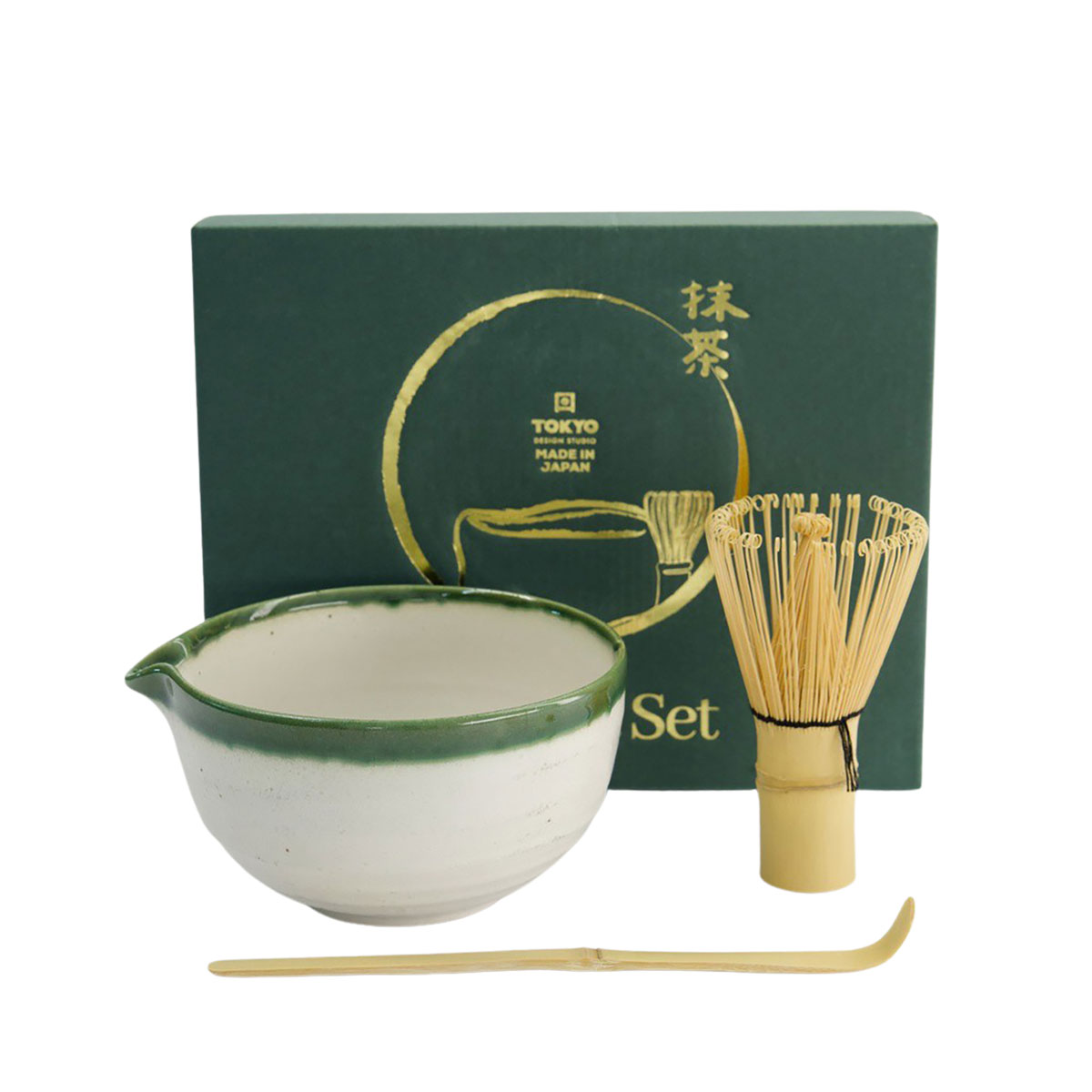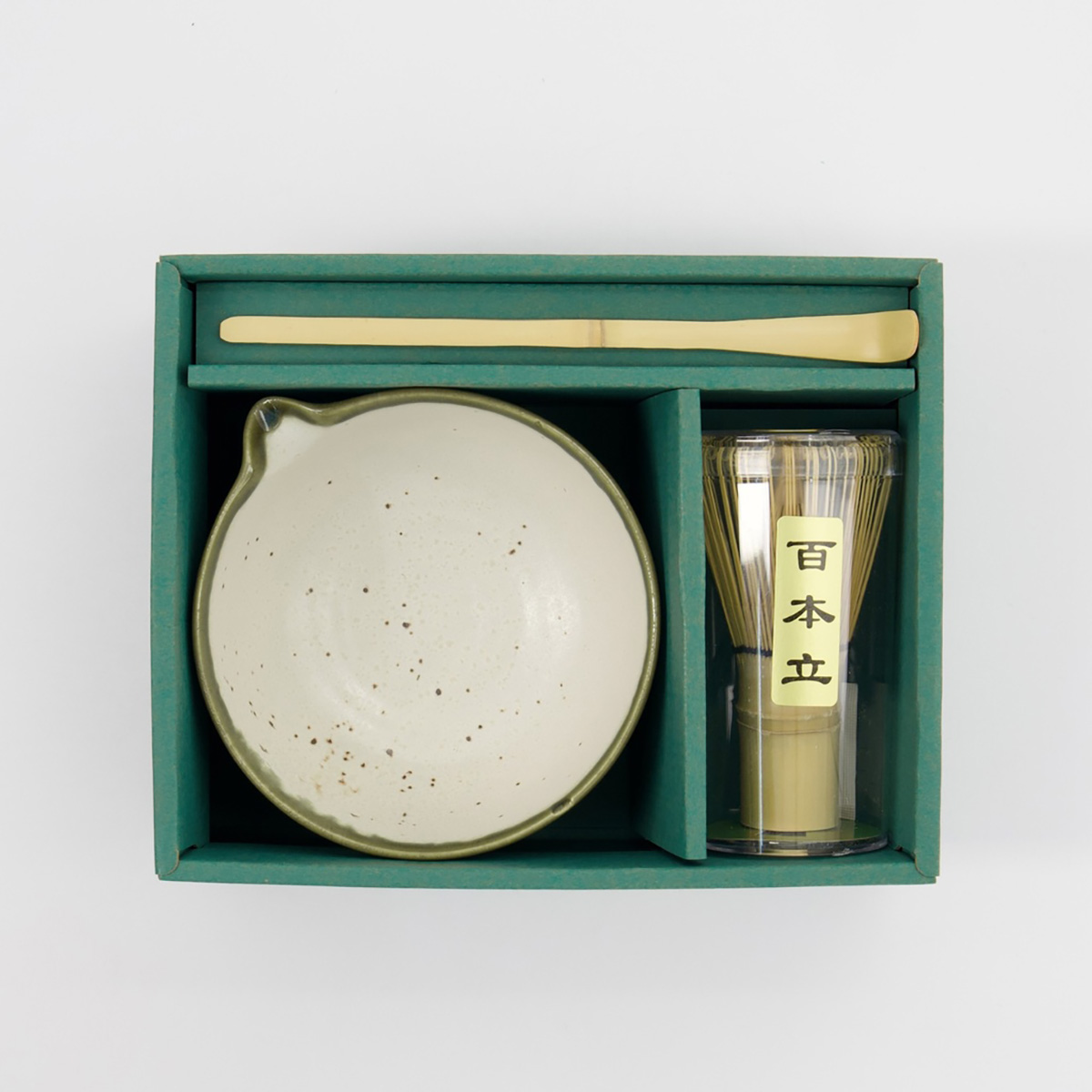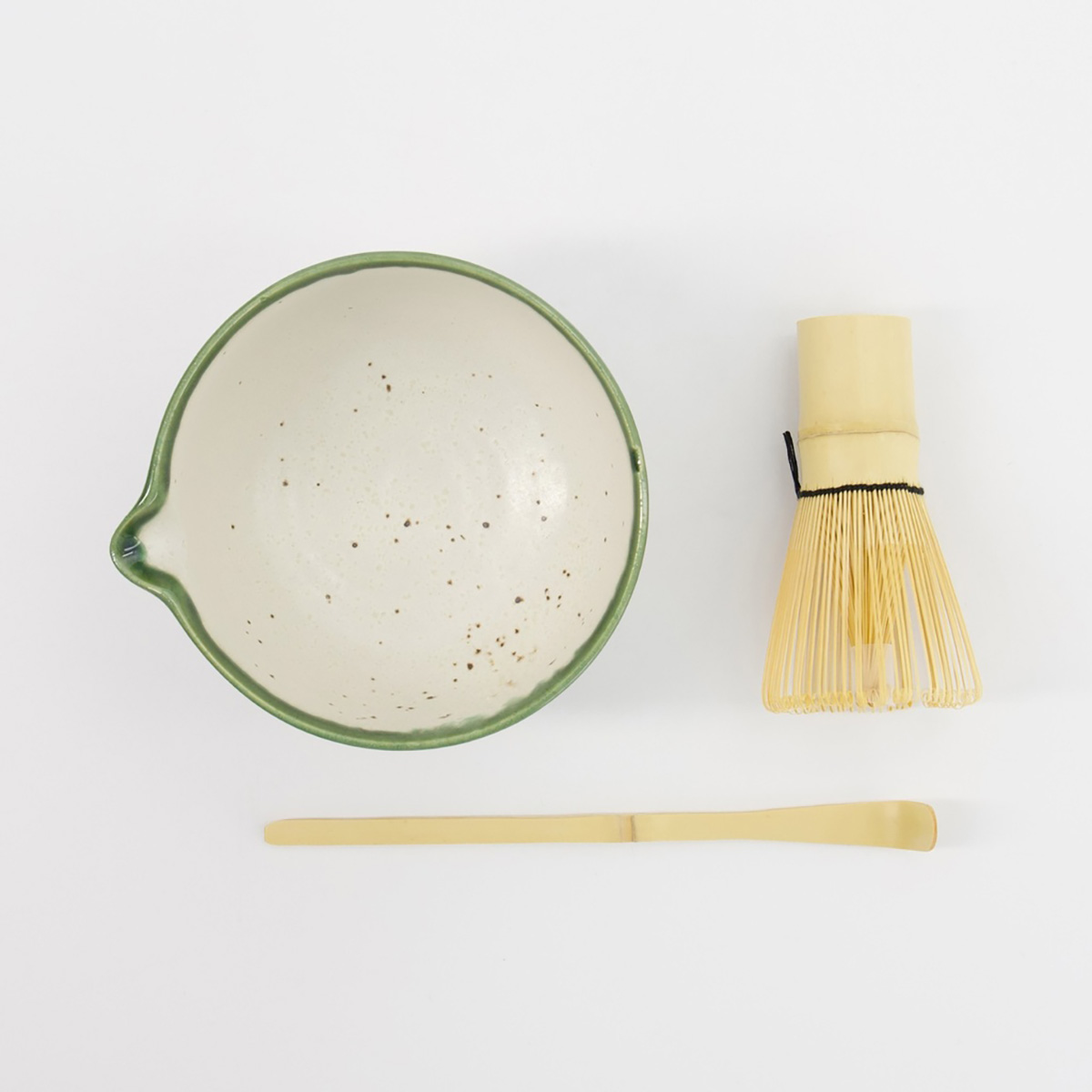 Ett stillsamt set för matcha, där varje del har sin plats i ritualen. Skålens vit och gröna glasyr är fin till matchans gröna färg. Formerna är enkla, utan överflöd. Tillsammans skapar de en helhet där funktion och närvaro möts, från dosering till vispning och vila. Särskilt hemma i vårens och sommarens ljus, där glaset förstärker känslan av lätthet. Ett set att återvända till, dag efter dag.