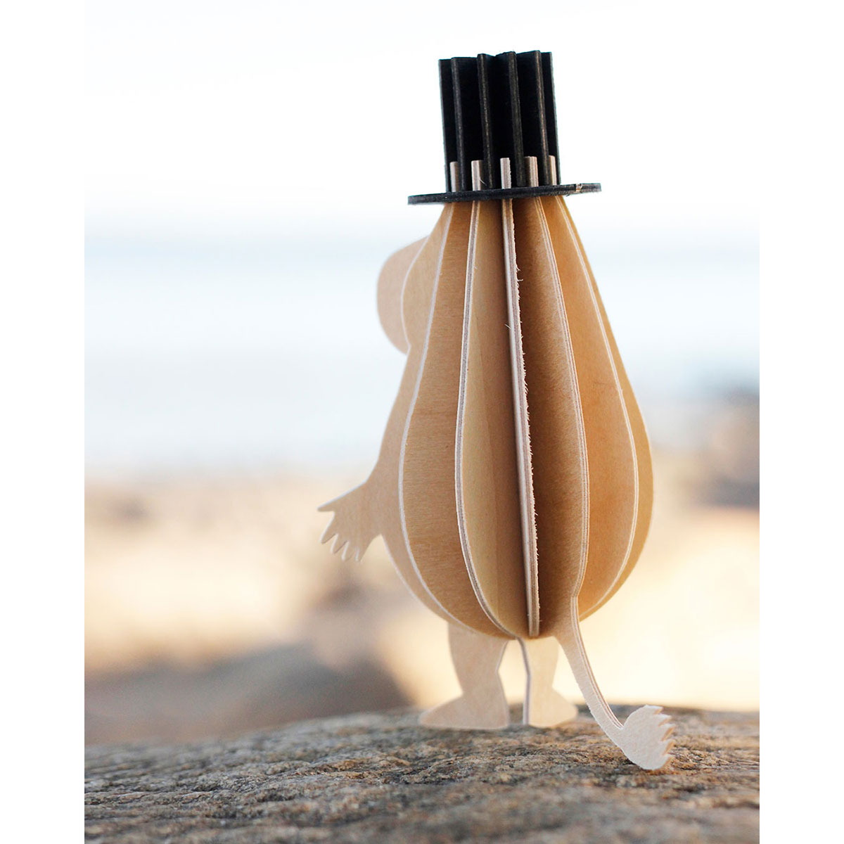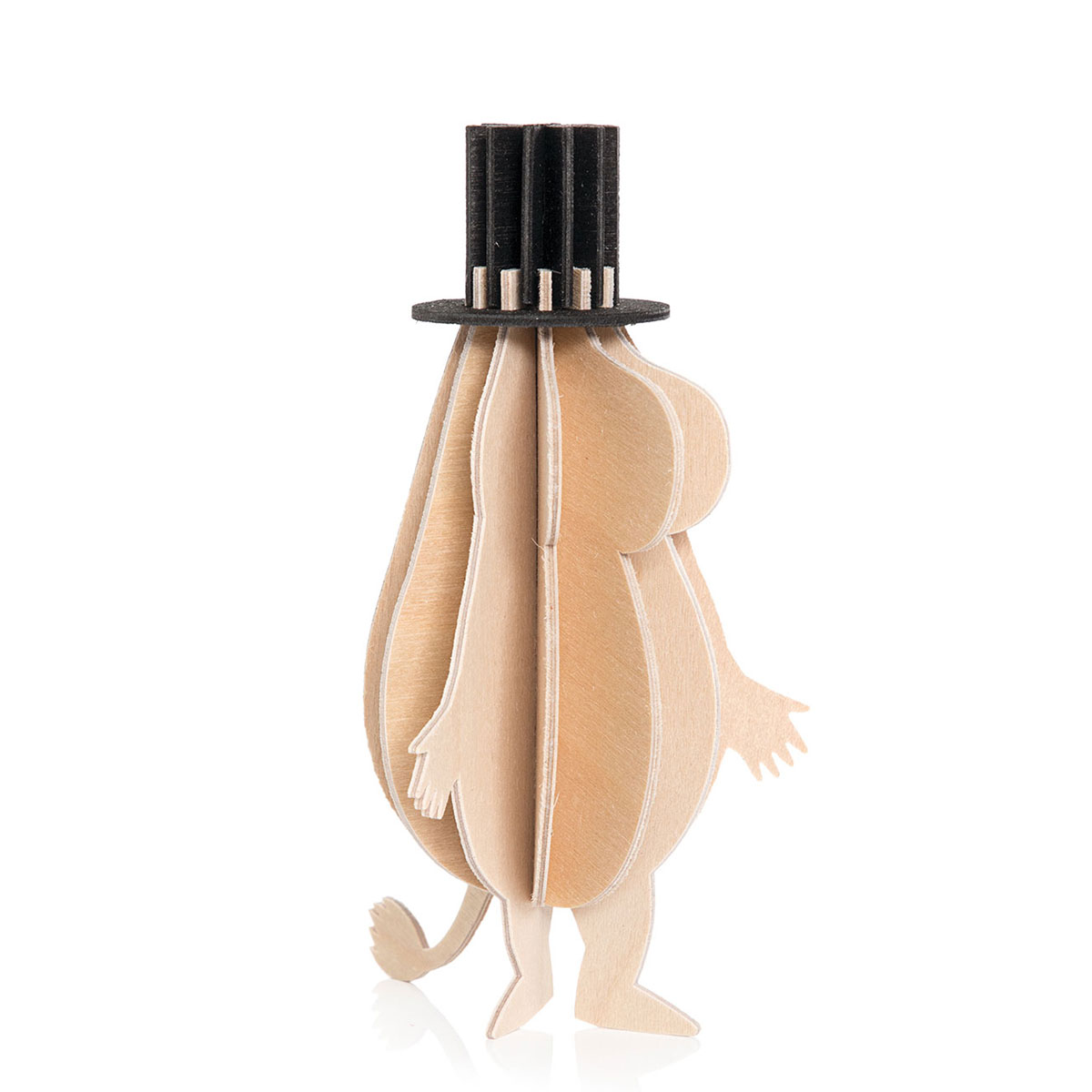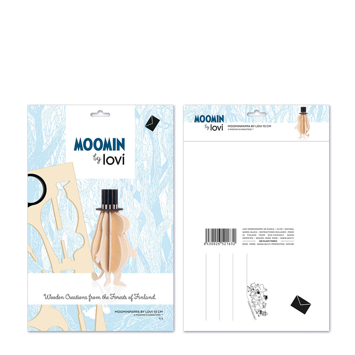 Muminpappan av Lovi bär sin signatur, en svart hög hatt, med stolthet. Till formen är han en mycket traditionell mumin. Under den runda nosen finns en fyllig mage. Armarna och benen är små och det finns en tofs i slutet av den långa svansen. Han skapades efter originalillustrationerna av Tove Jansson, den älskade författaren och illustratören av Muminberättelser. Familjen är det viktigaste i livet för denna pojkaktiga karaktär och han är redo att göra vad som helst för Muminmamma och Mumintrollet. Ibland börjar livet i Mumindalen tråka Muminpappan. Det är då han packar sina saker, ibland även sin familj, och…