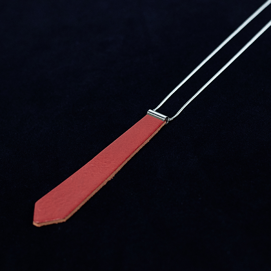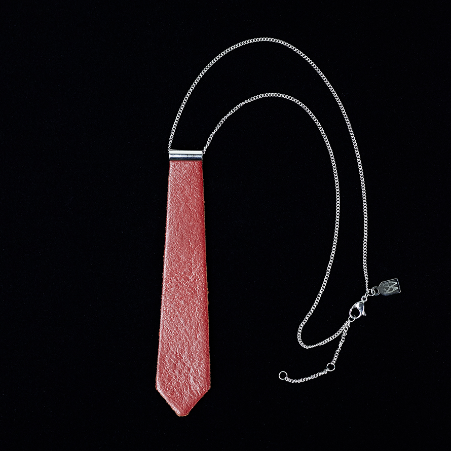 Halsband med titeln ”My Tie Necklace” i svart eller rött av Kajsa Avila. Rostfritt stål och stansat restbitsläder. Slipsens längd är ca 12 cm. Längden på kedjan kan varieras mellan 45, 47,5 eller 50 cm beroende på i vilken ögla man fäster låset.