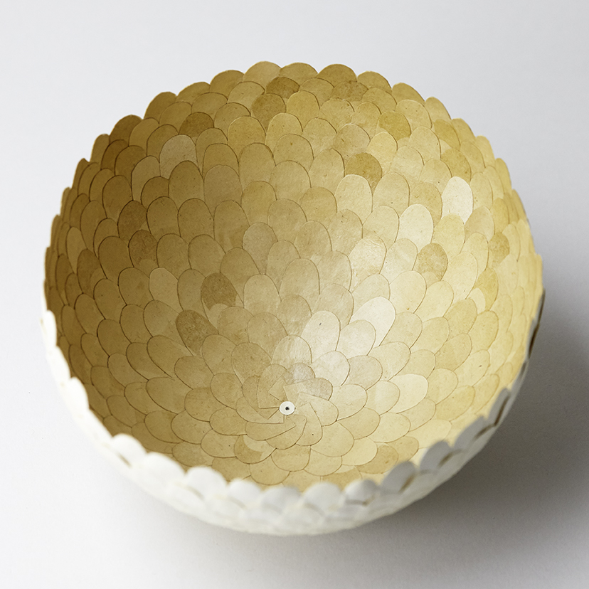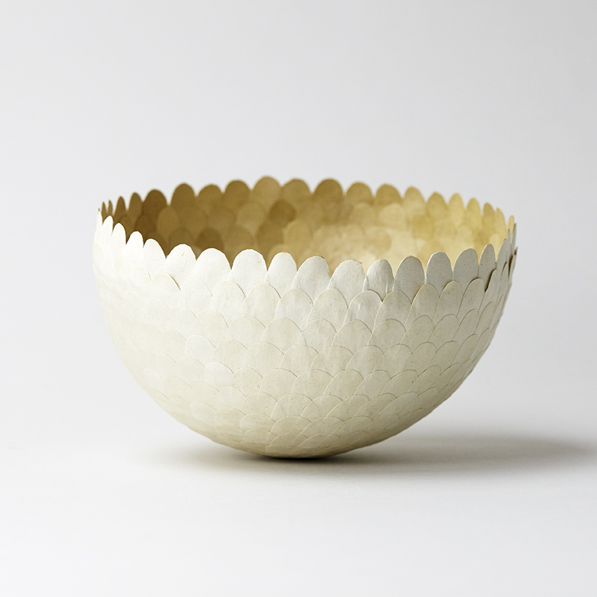 Skål med titeln ”Maiden” av Cecilia Levy. Gjord av gamla boksidor.