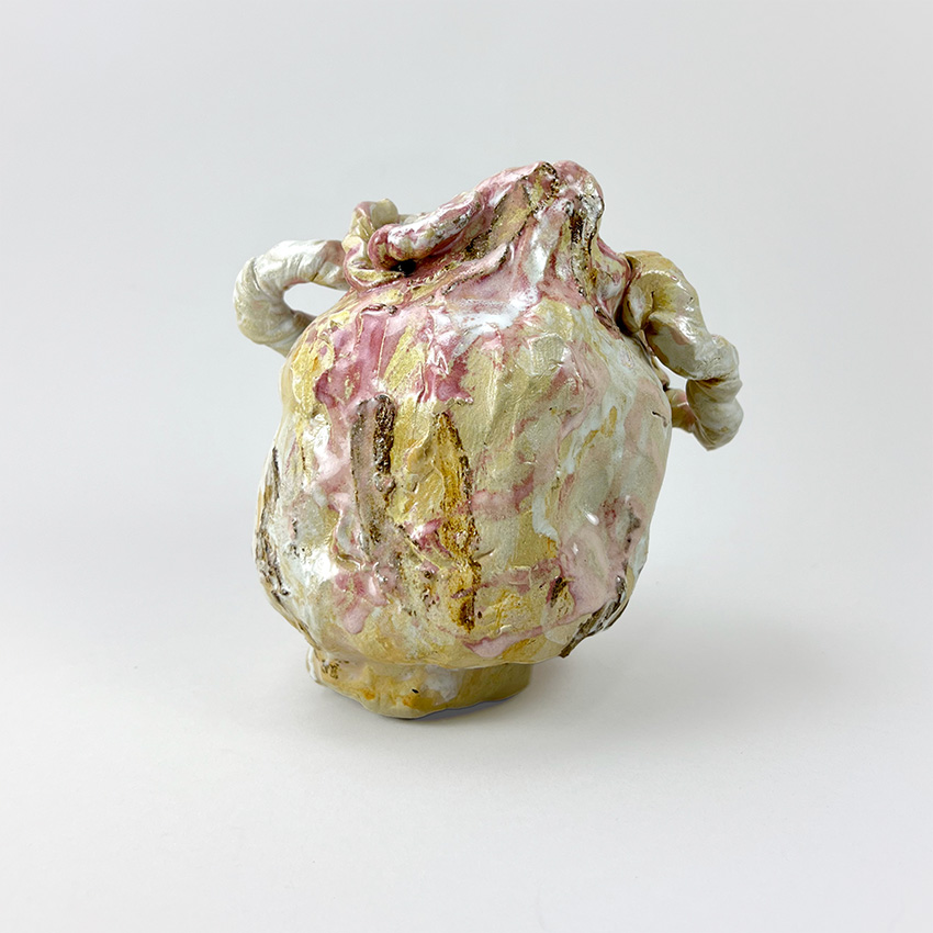 Skulptural vas i stengods och lergods av Irys Kluska. Delvis glaserad i vitt, rosa, beige och brunt.