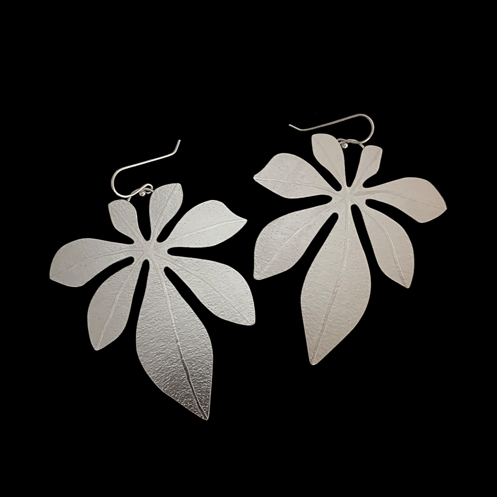 Örhängen i form av kastanjelöv av Caroline Lindholm. Etsat silver.